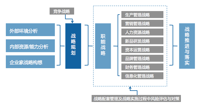 通过对企业内部环境的分析与评价,结合企业家的战略构想和相关者利益等要素,明确企业的基本战略、发展战略和竞争战略。根据需要,在总体战略指导下制定各职能战略和业务单元战略,包括产品战略、品牌战略、营销战略、资本运营战略等。通过企业管控模式设计、组织结构调整、制度和流程优化、战略目标分解、计划和预算控制、绩效管理等手段打造高效协同的组织运营体系,确保企业战略的有效实施。